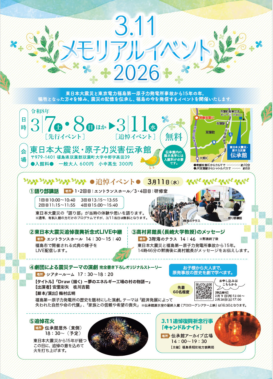 「3.11メモリアルイベント2026」の会場は、東日本大震災·原子力発電所伝承館となっていて、東日本大震災と東京電力福島第一原子力発電所事故から15年となるこの年に、犠牲となった方々を悼み、震災の記憶を伝承し、福島の今を発信する内容となっています。会場内で「東日本大震災追悼復興祈念式」のLIVE中継も行われるそうで、先行イベントとして、3月7日(土)·8日(日)にも、トークセッションやミニコンサートなども行われる予定です。